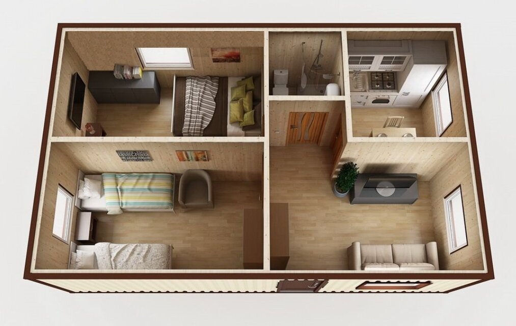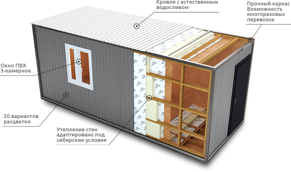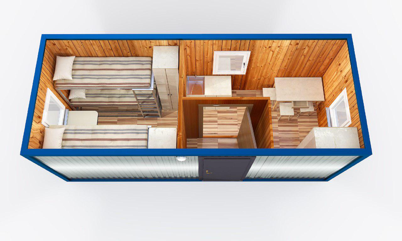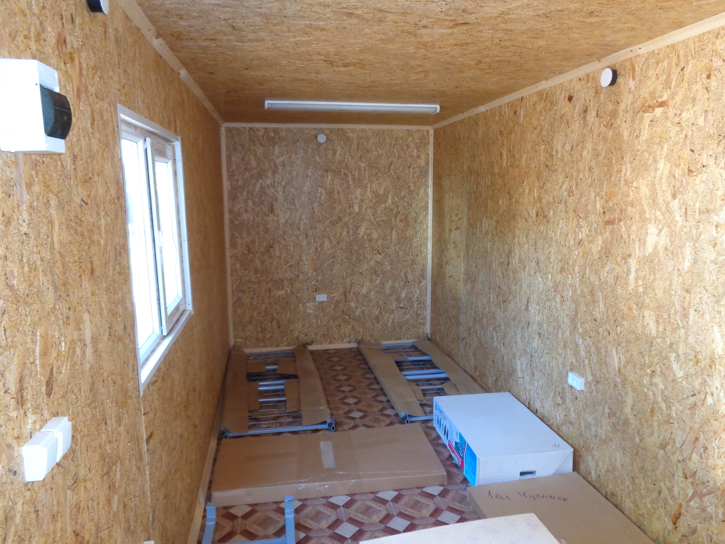 Помещение бытовки разделено на несколько зон: кухня, туалет, спальня, раздевалка. Для временного проживания бытовка оснащается необходимым оборудованием и мебелью.