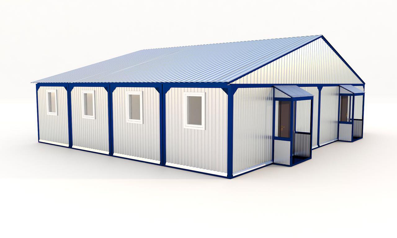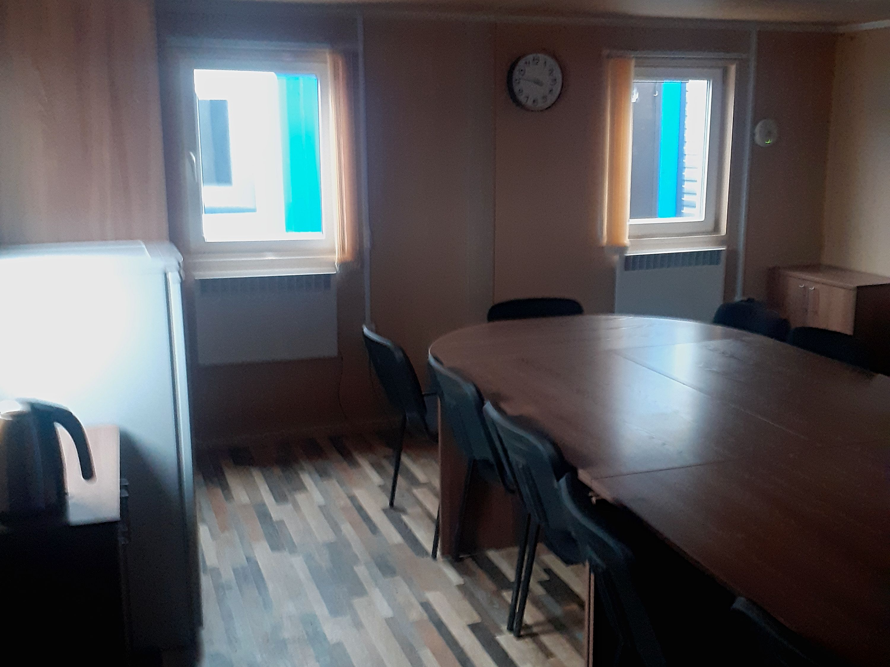 Используется также на промышленных объектах. Служит для организации питания рабочих или строителей. Имеет зону кухни и зону столовой.